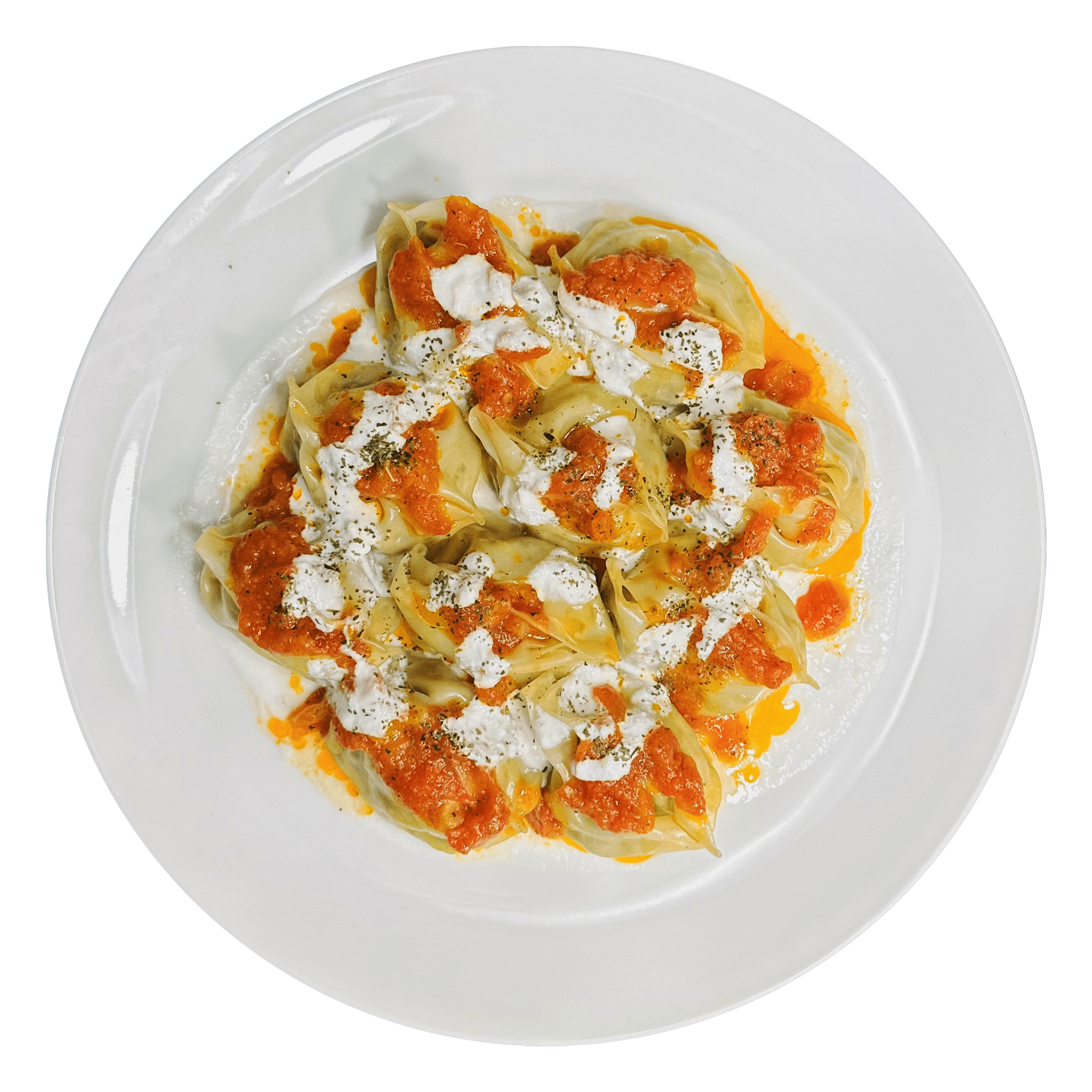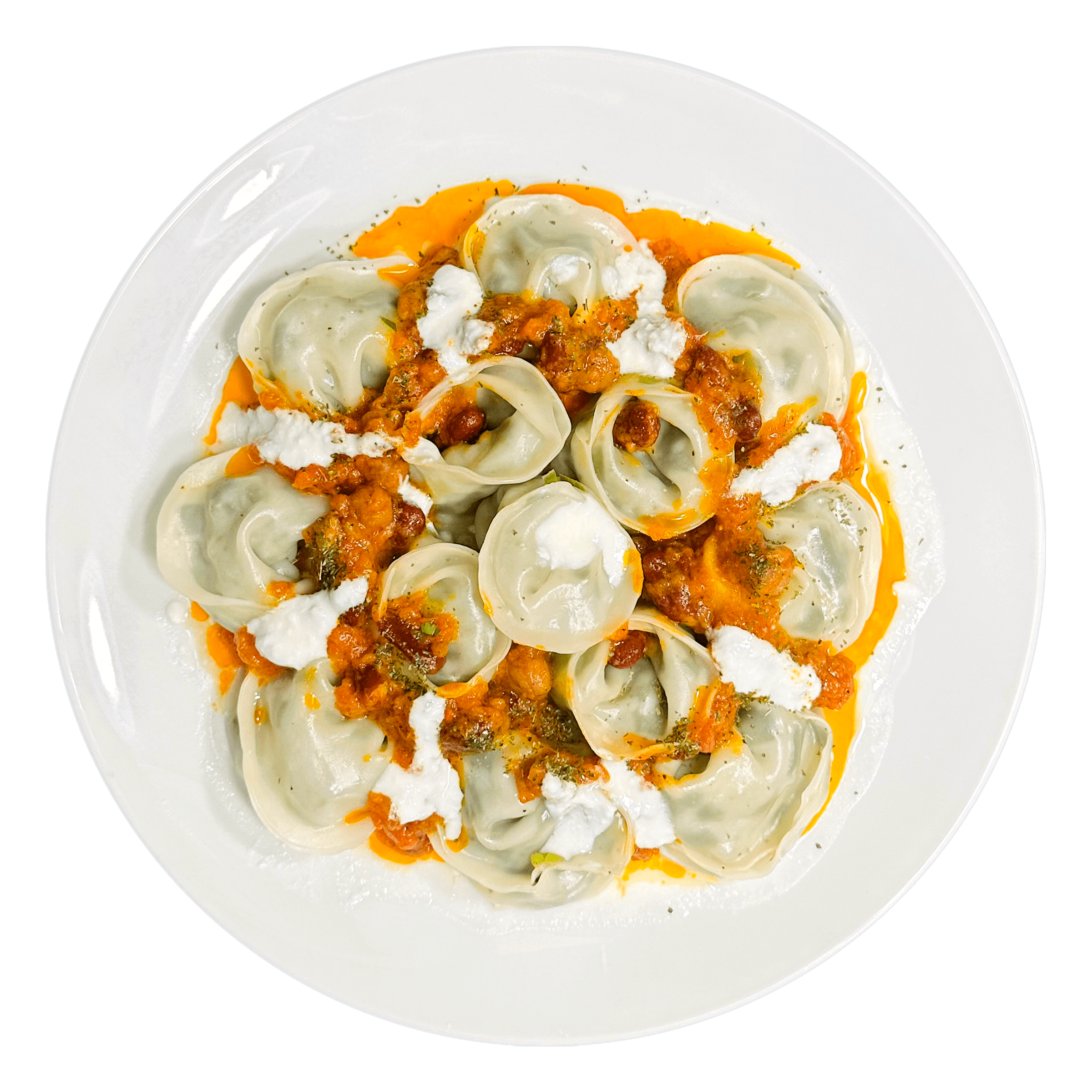 9 pieces of steamed dumplings filled with cabbage, potato, bill paper, onion, coriander & herbs. Topped with tomato, parsley & yogurt