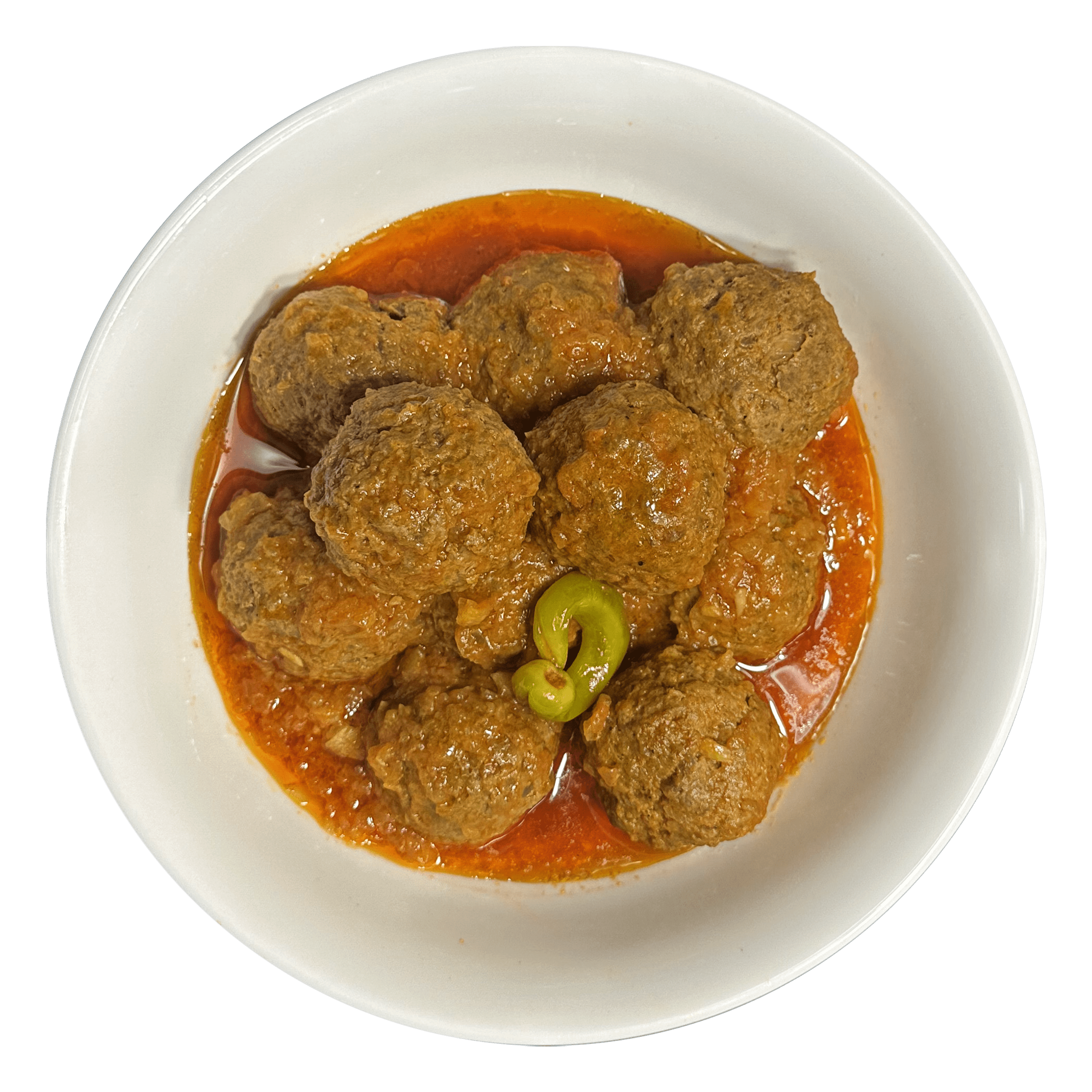 6 pieces of Afghan-flavored meatballs made with grounded beef mixed with onions, herbs & spice in tomato sauce