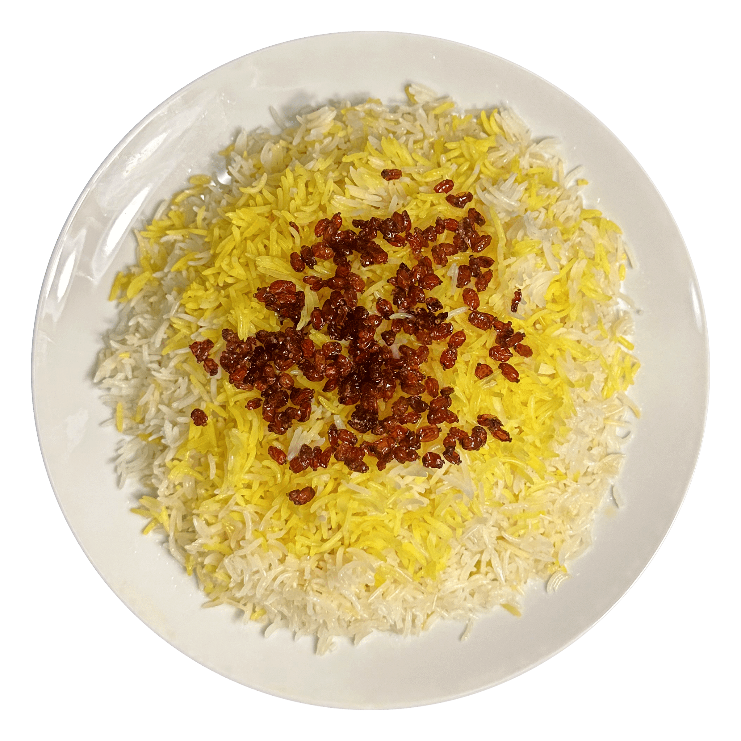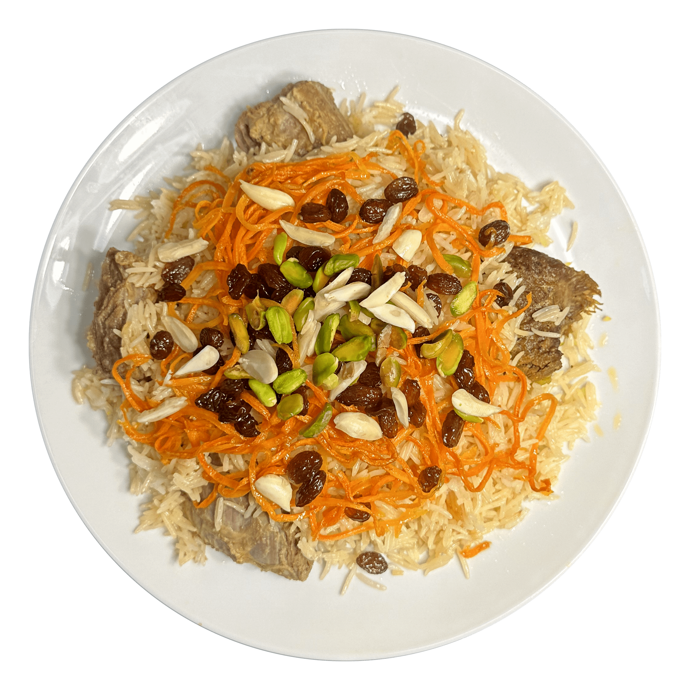 Basmati rice and chunk of beef topped with fried carrot, raisins & almonds